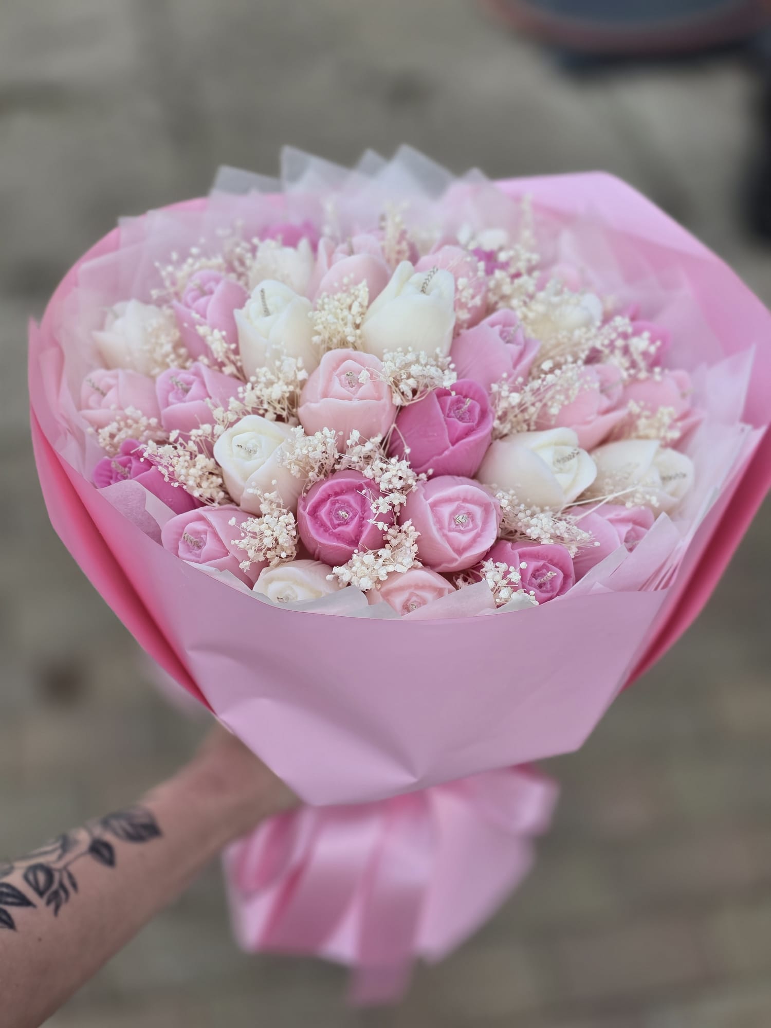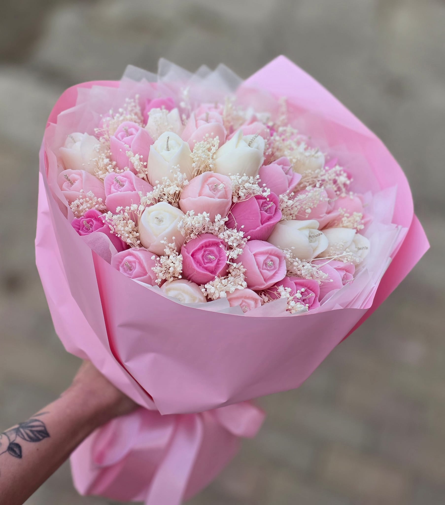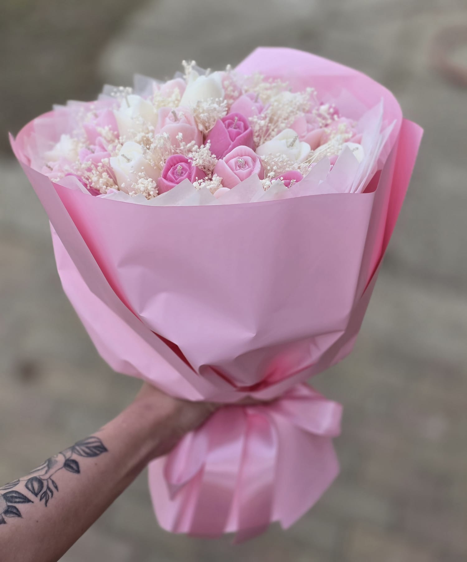 Elegants un gaumīgs sveču pušķis maigos toņos, kas kalpos gan kā izsmalcināts interjera akcents, gan kā īpaša dāvana nozīmīgos dzīves brīžos. Pušķis ir veidots no 36 sveču ziediem, radot bagātīgu, ziedošu kompozīciju.
