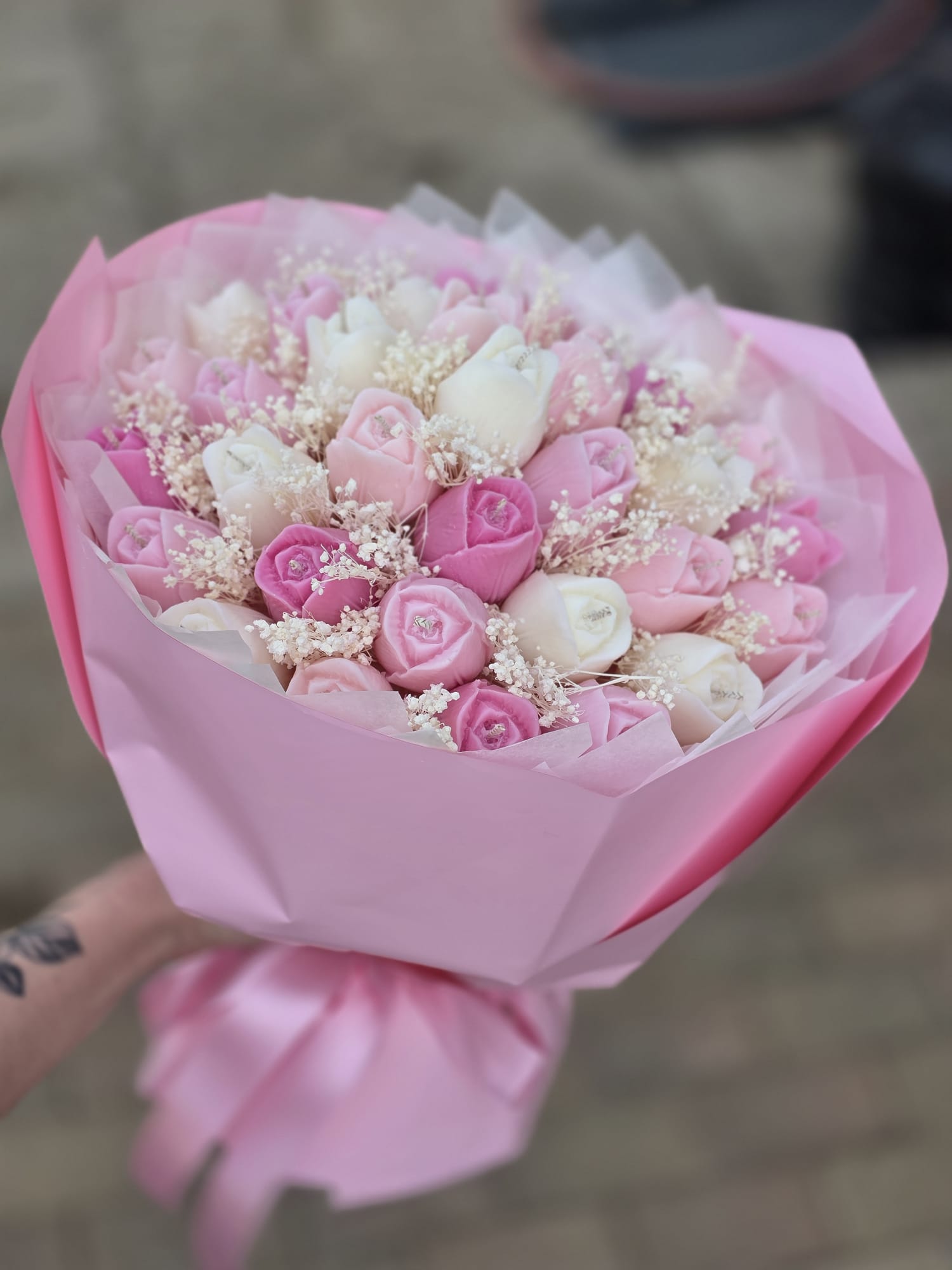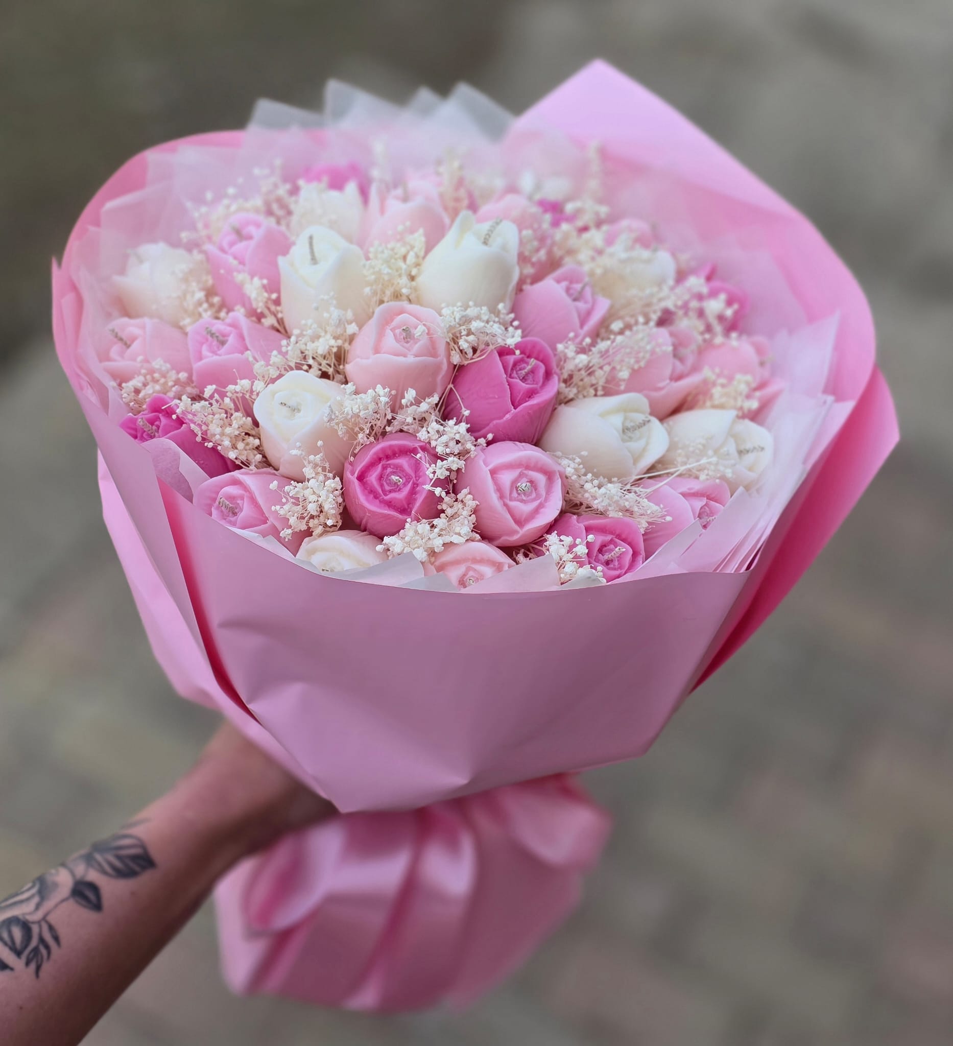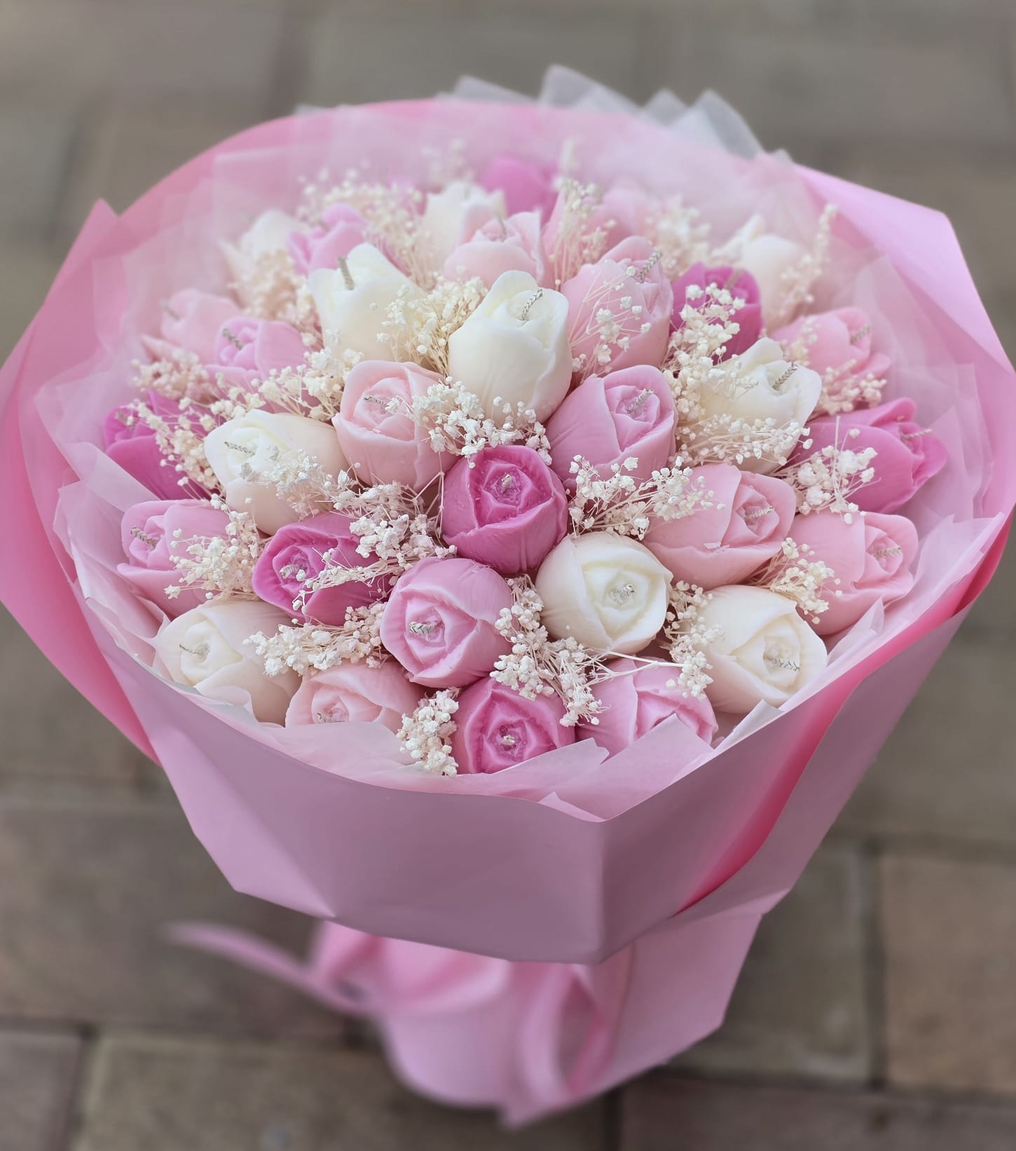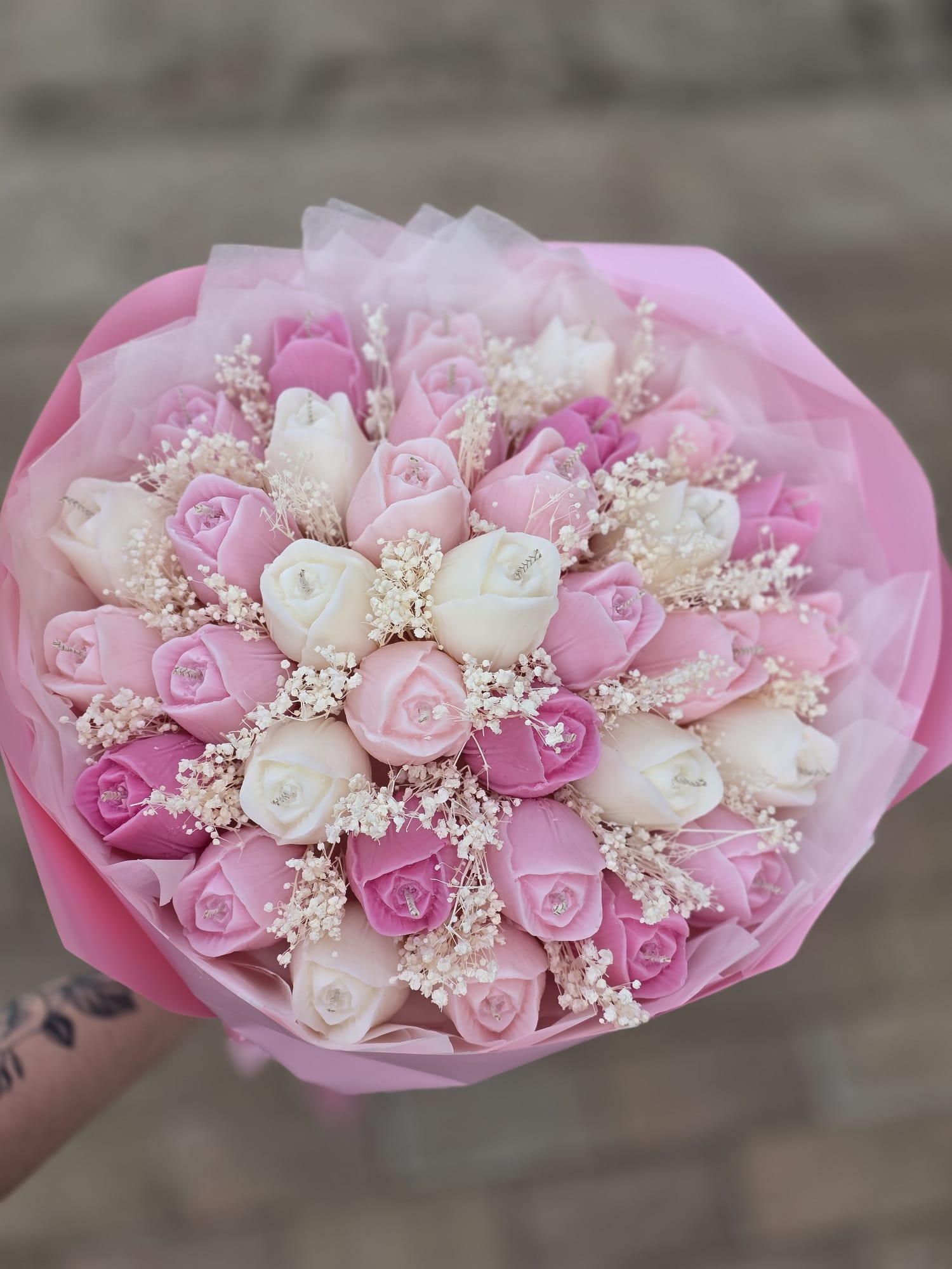 Elegants un gaumīgs sveču pušķis maigos toņos, kas kalpos gan kā izsmalcināts interjera akcents, gan kā īpaša dāvana nozīmīgos dzīves brīžos. Pušķis ir veidots no 36 sveču ziediem, radot bagātīgu, ziedošu kompozīciju.