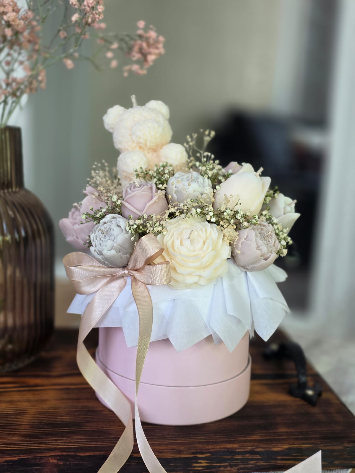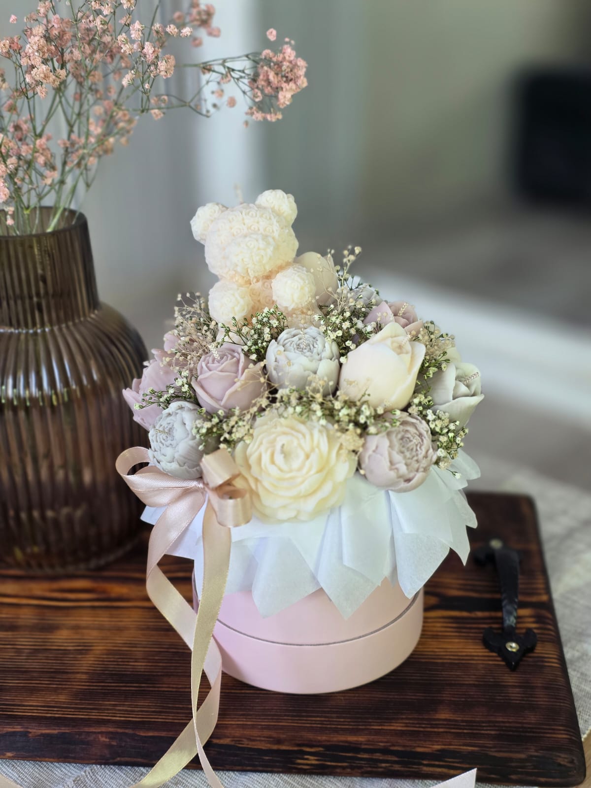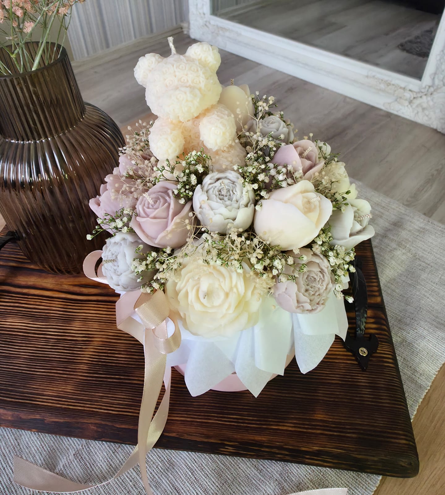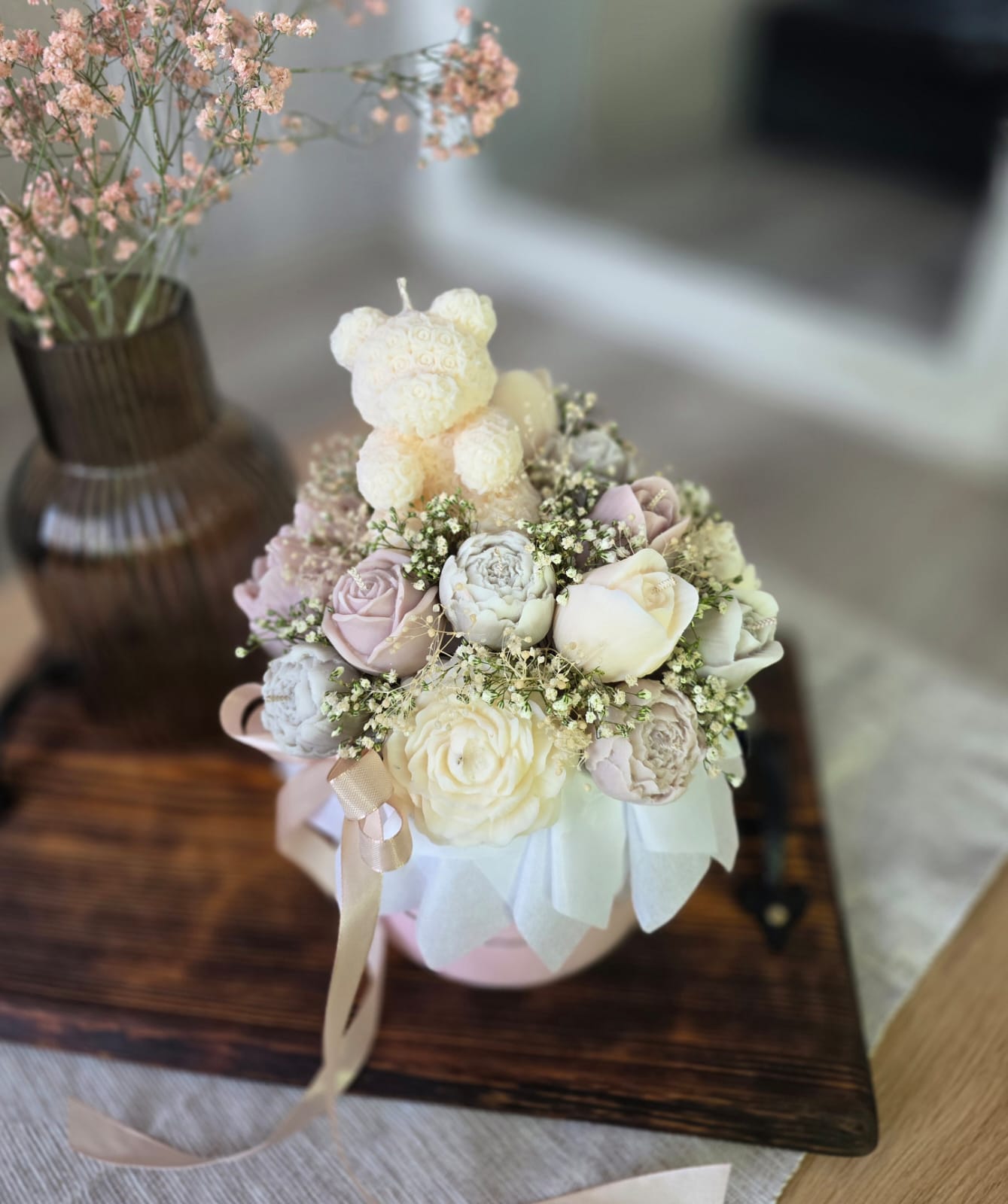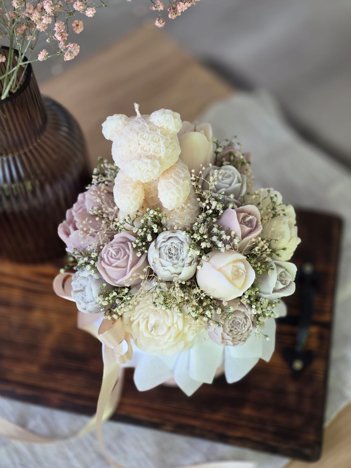 Sveču un dekoru noformējumā tiek izmantoti kaltēti ziedi (ģipsene un citi), kas paredzēti ilgstošai dekorēšanai, nevis kā dzīvi ziedi.