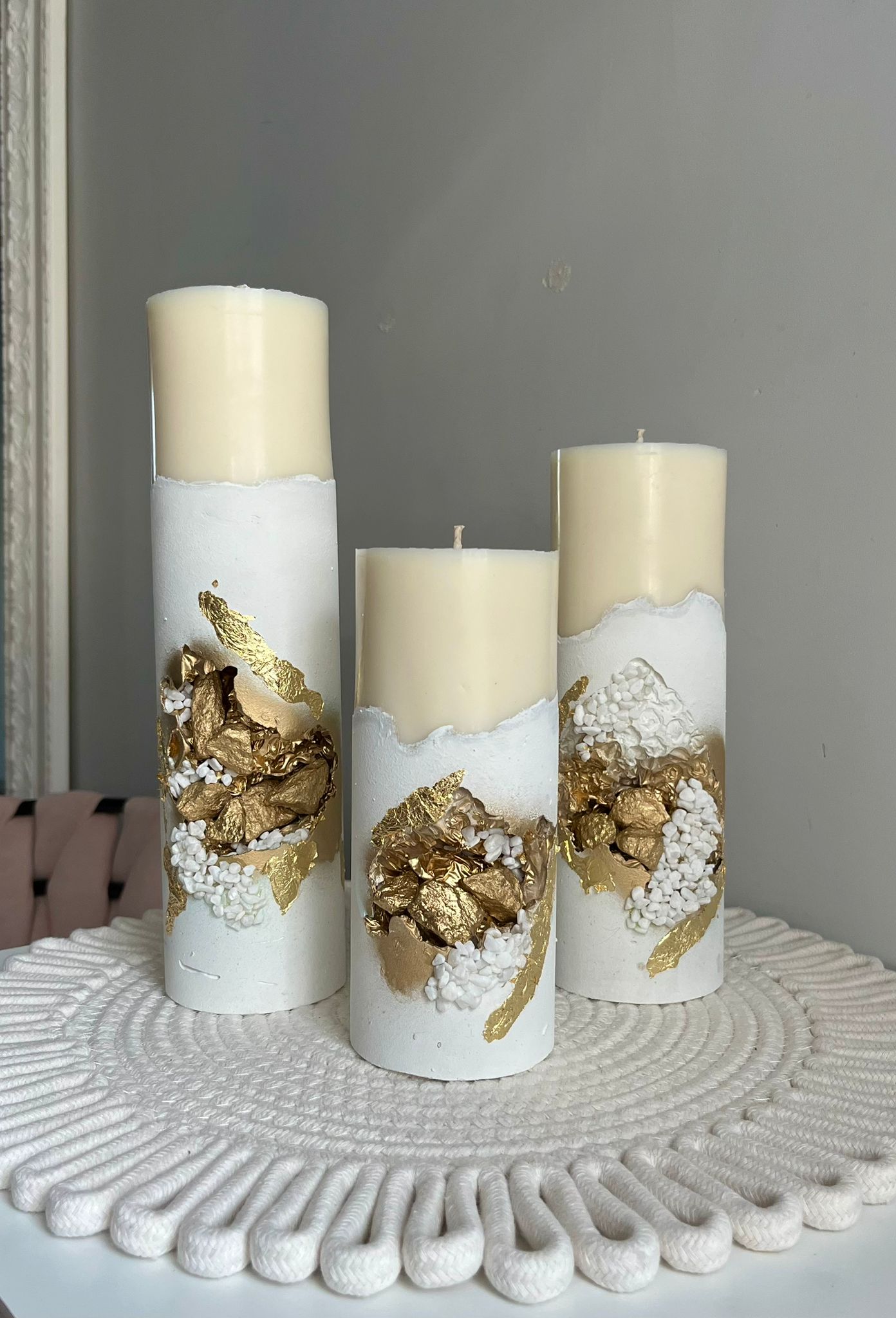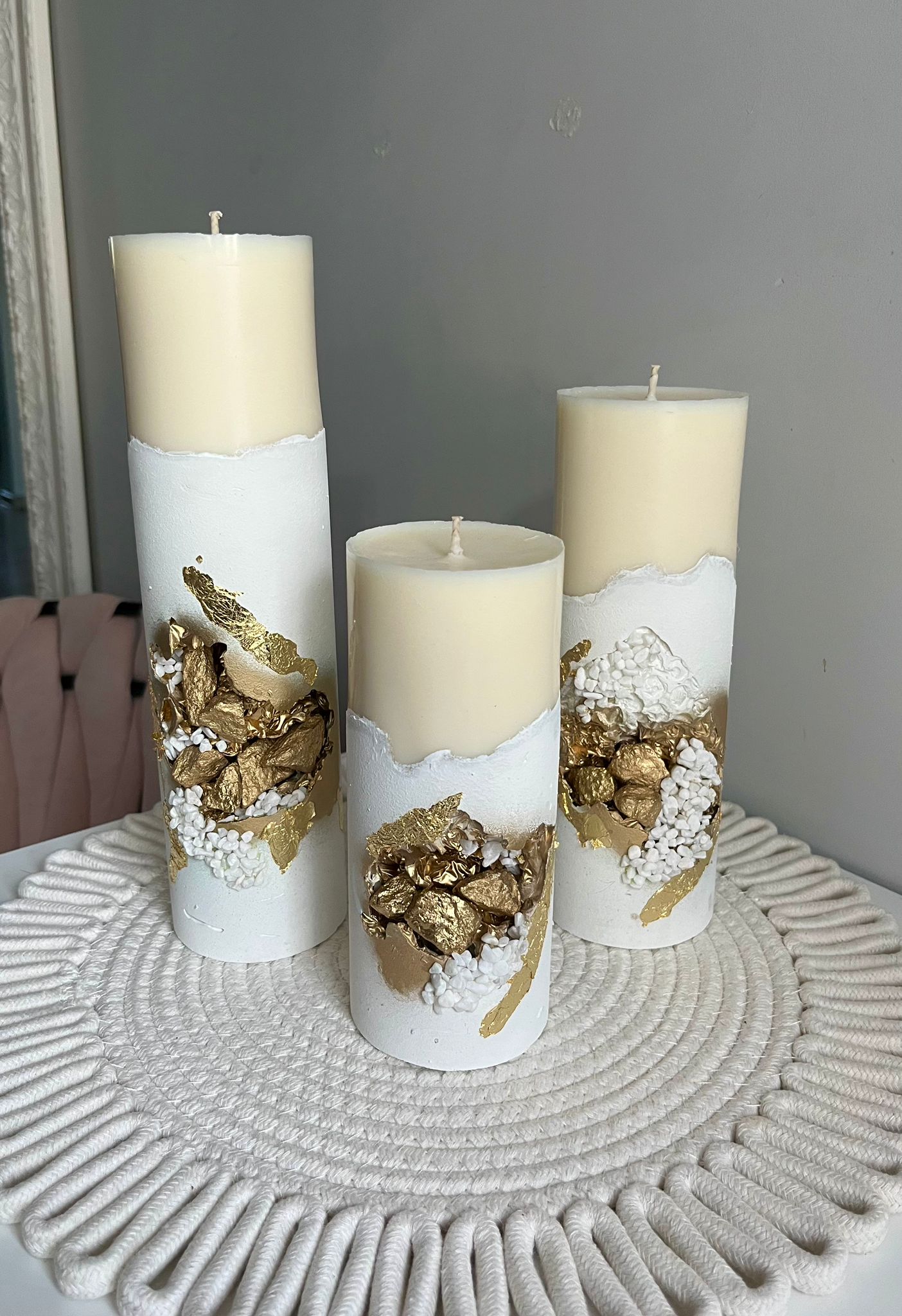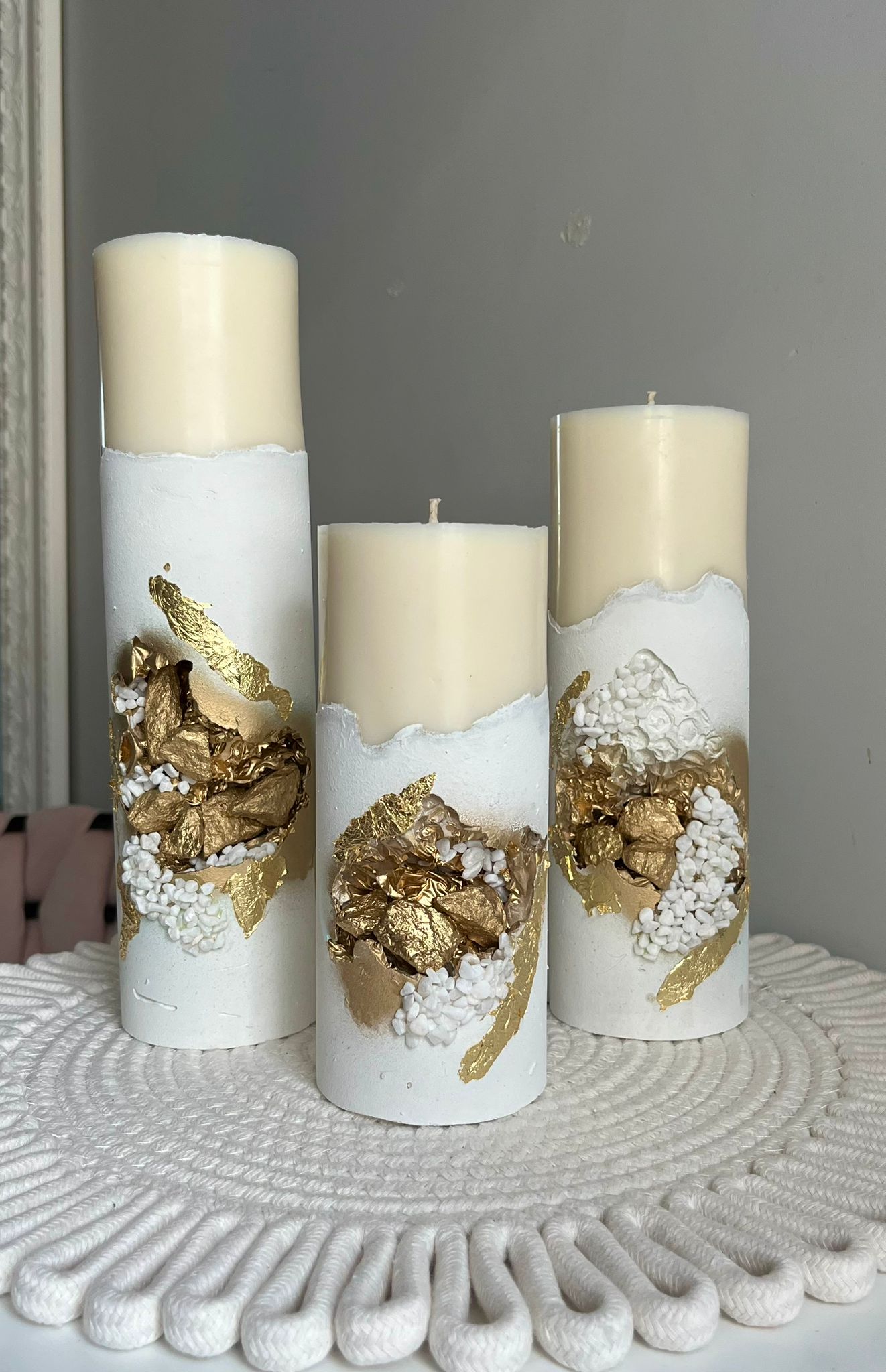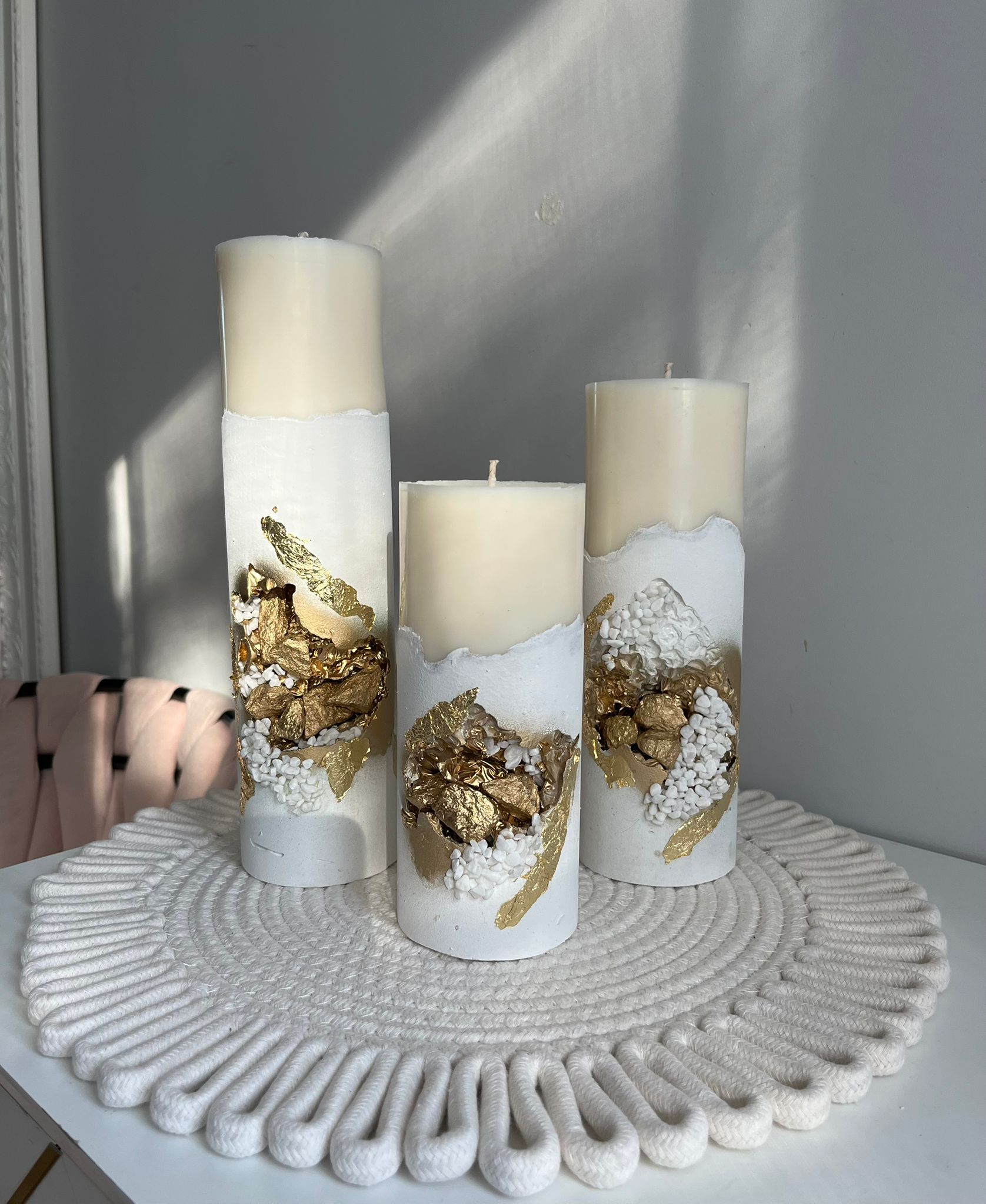 Komplektā trīs sveces : izmēri – mazā 19.cm , vidējā 23.cm , lielā 26cm , sveču diametrs 7.5cm