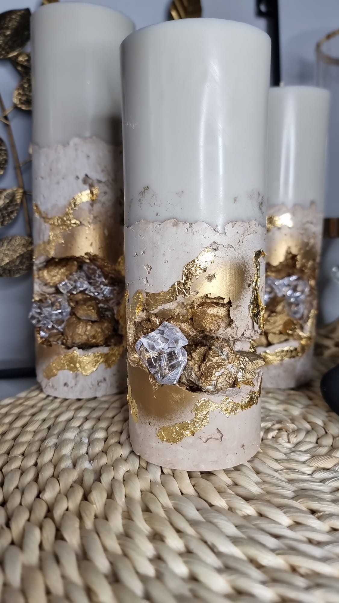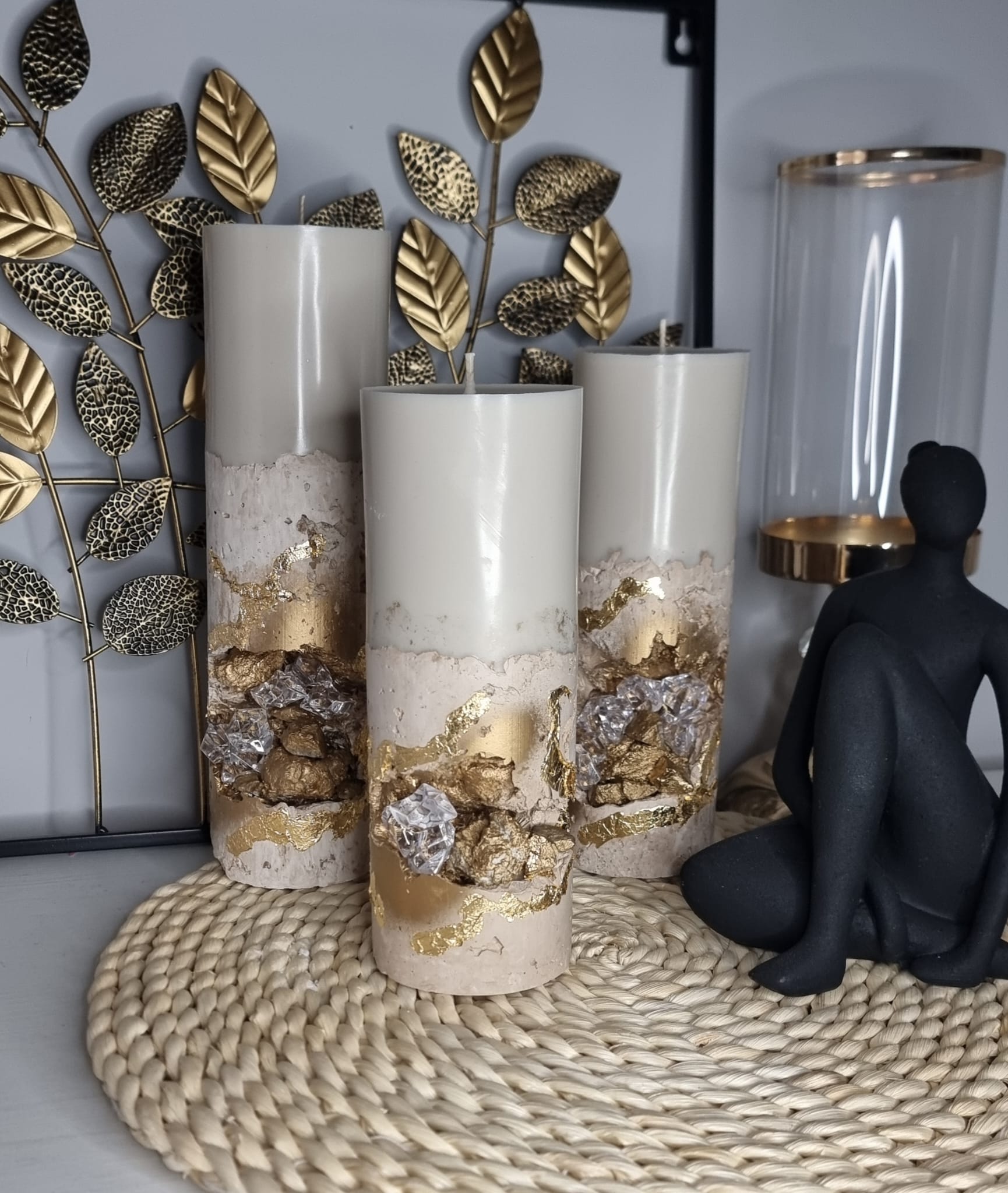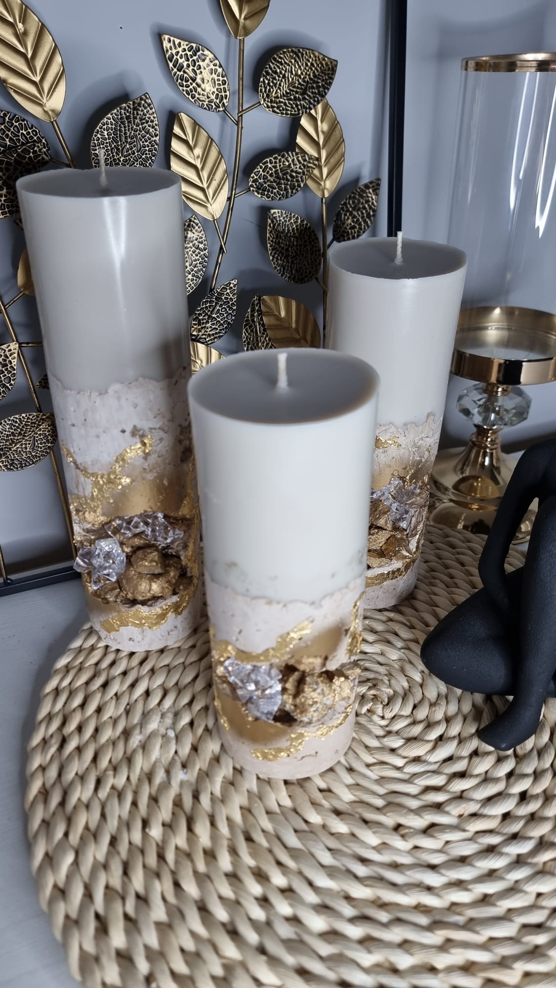 Komplektā trīs sveces : izmēri – mazā 19.cm , vidējā 23.cm , lielā 26cm , sveču diametrs 7.5cm