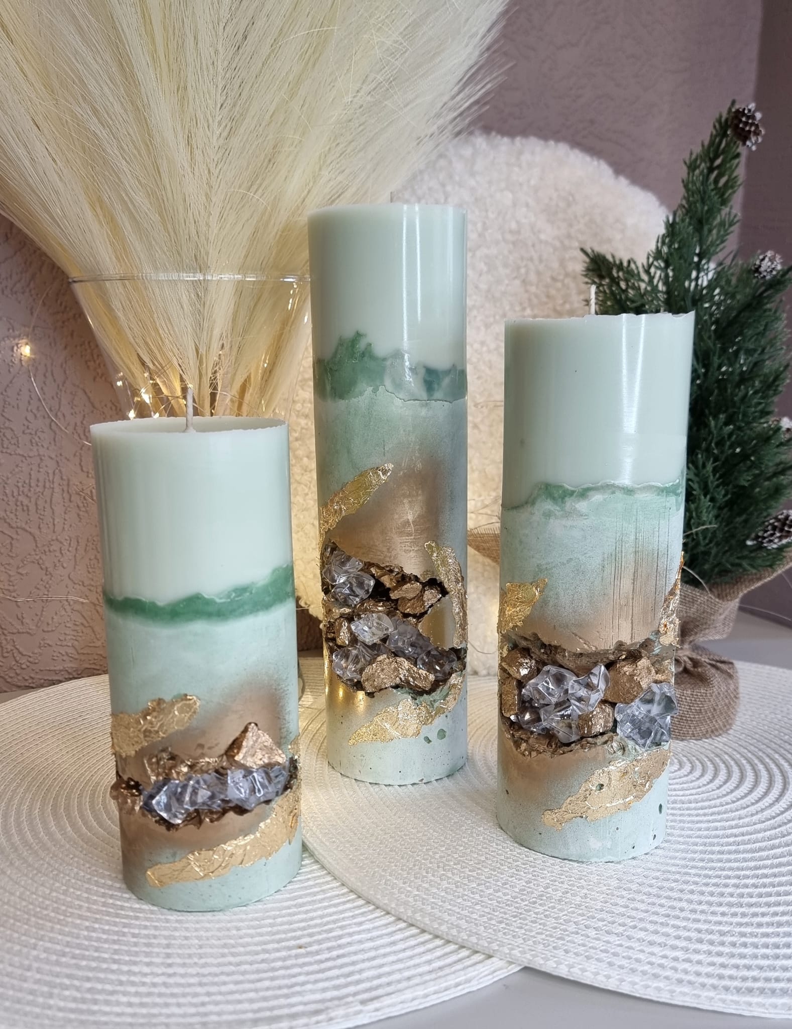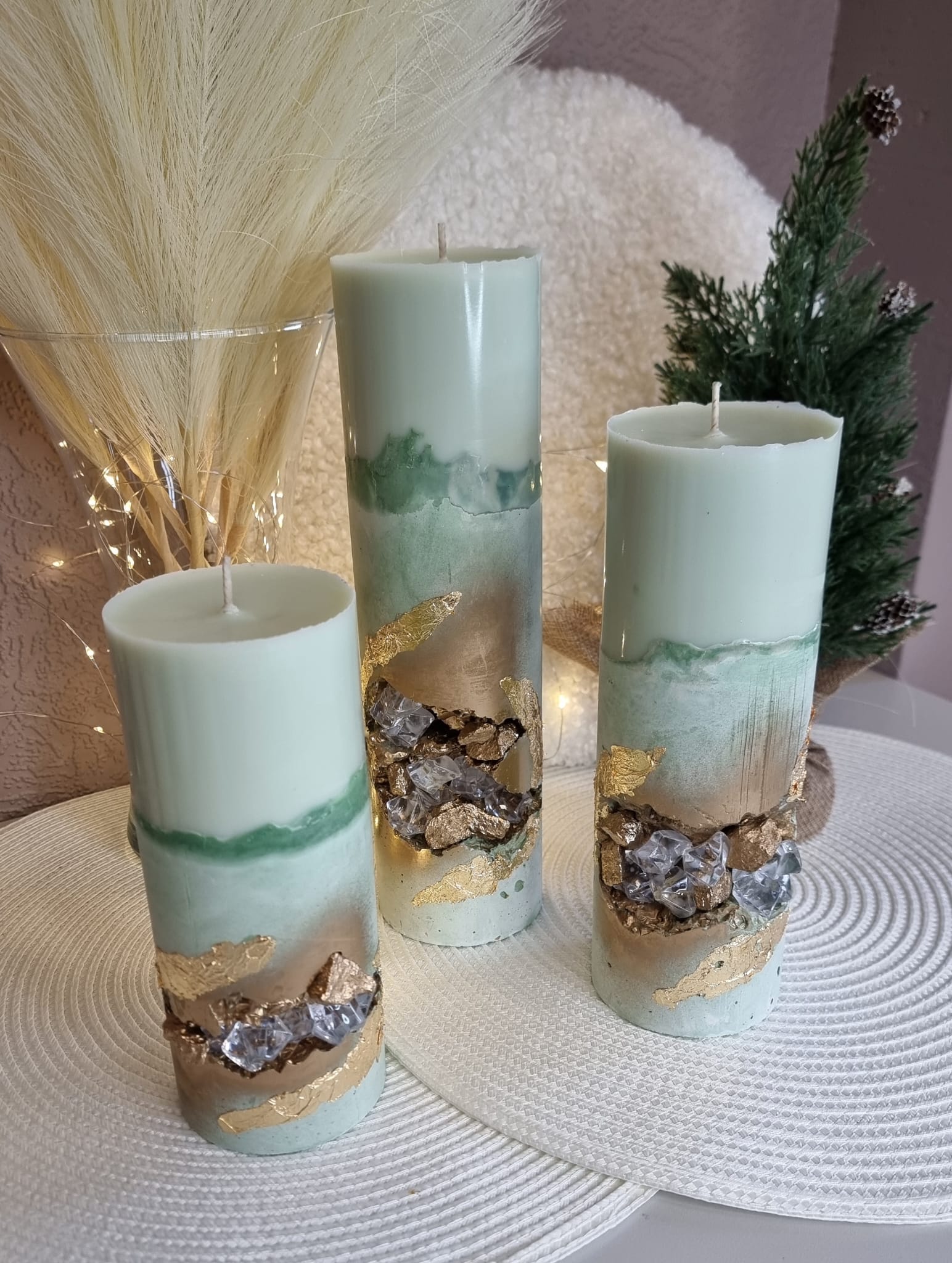 Komplektā trīs sveces : izmēri – mazā 19.cm , vidējā 23.cm , lielā 26cm , sveču diametrs 7.5cm