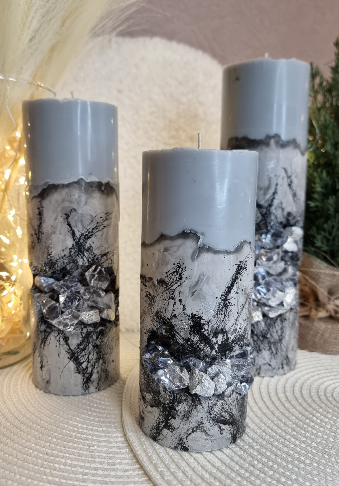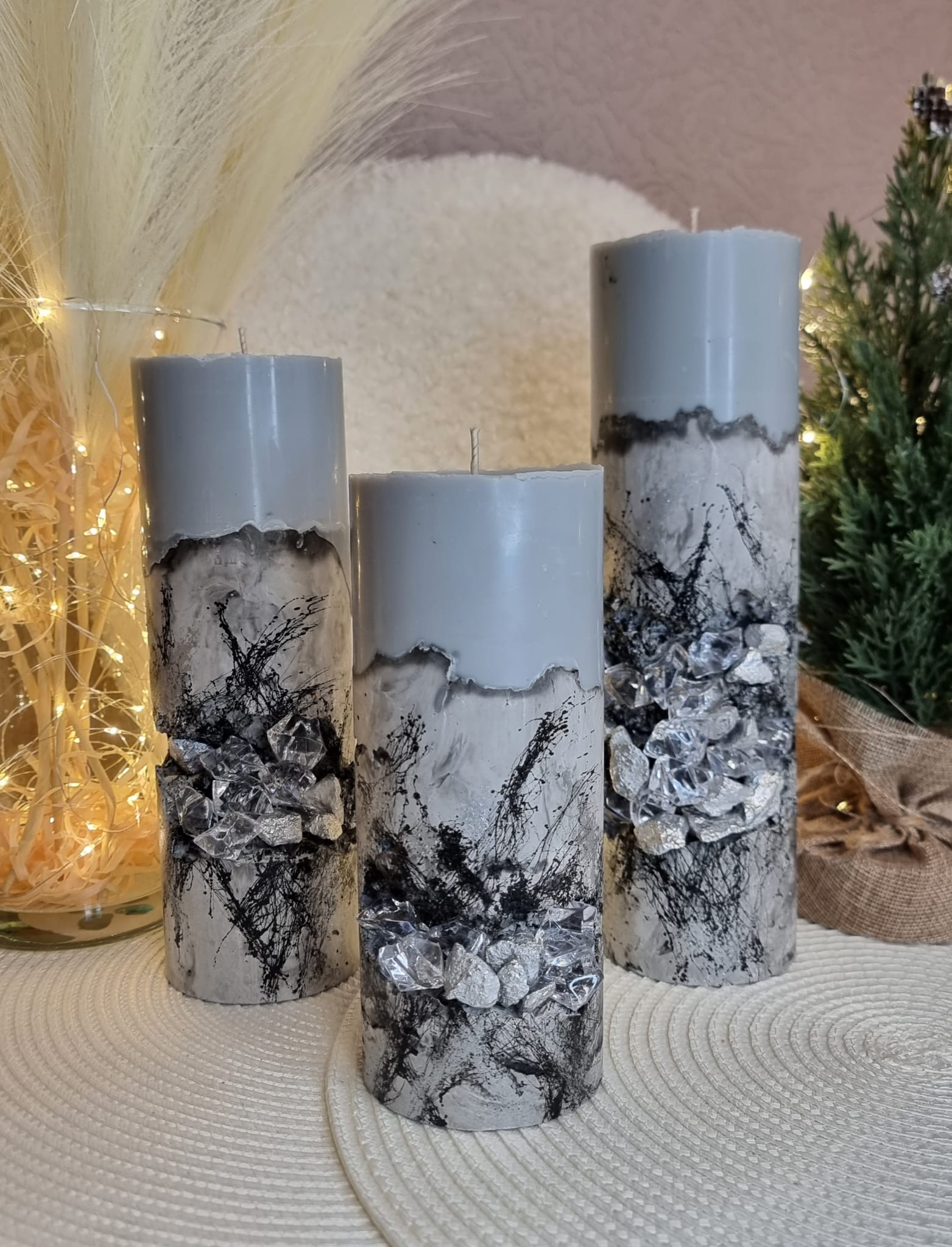 Komplektā trīs sveces : izmēri – mazā 19.cm , vidējā 23.cm , lielā 26cm , sveču diametrs 7.5cm