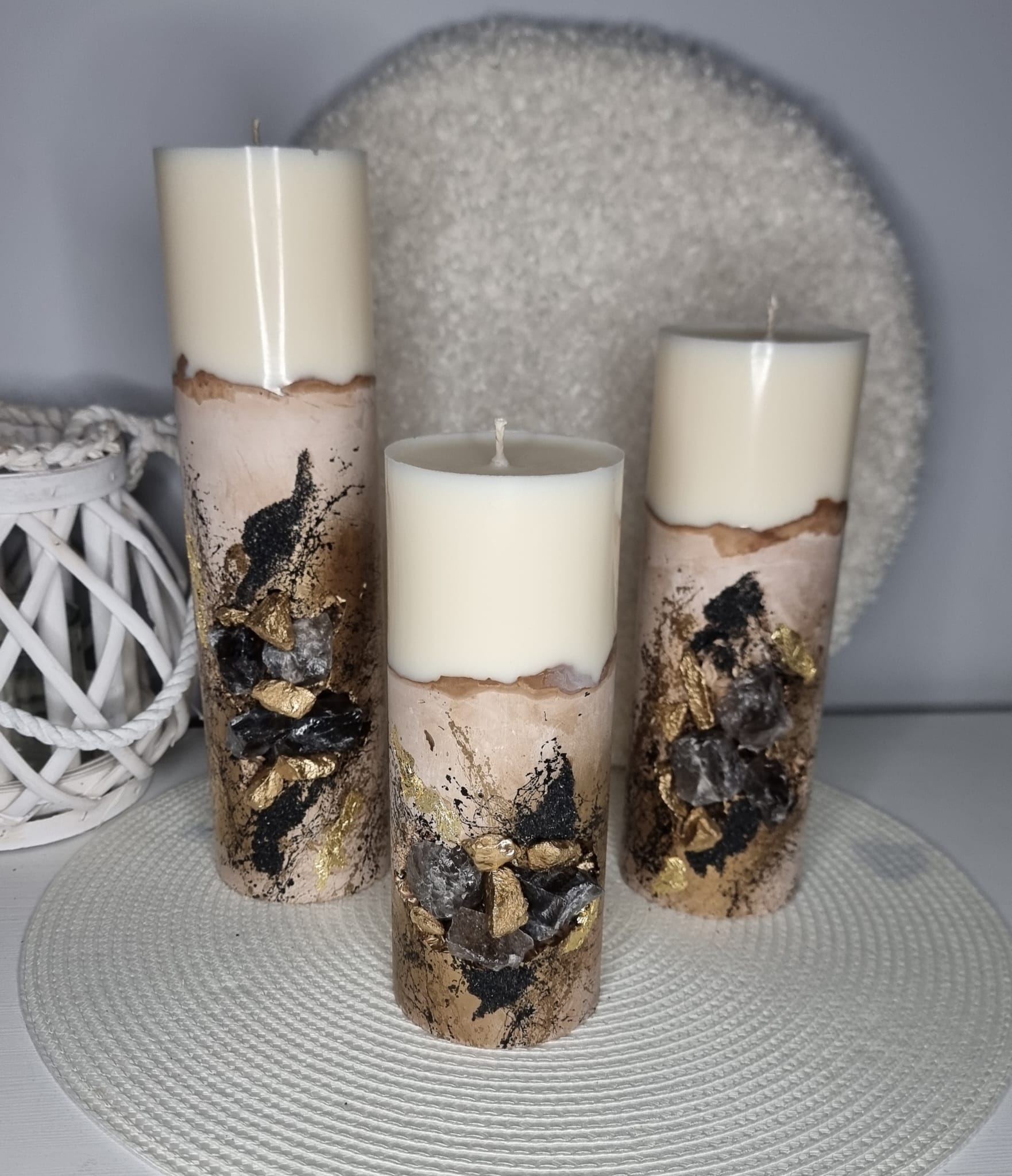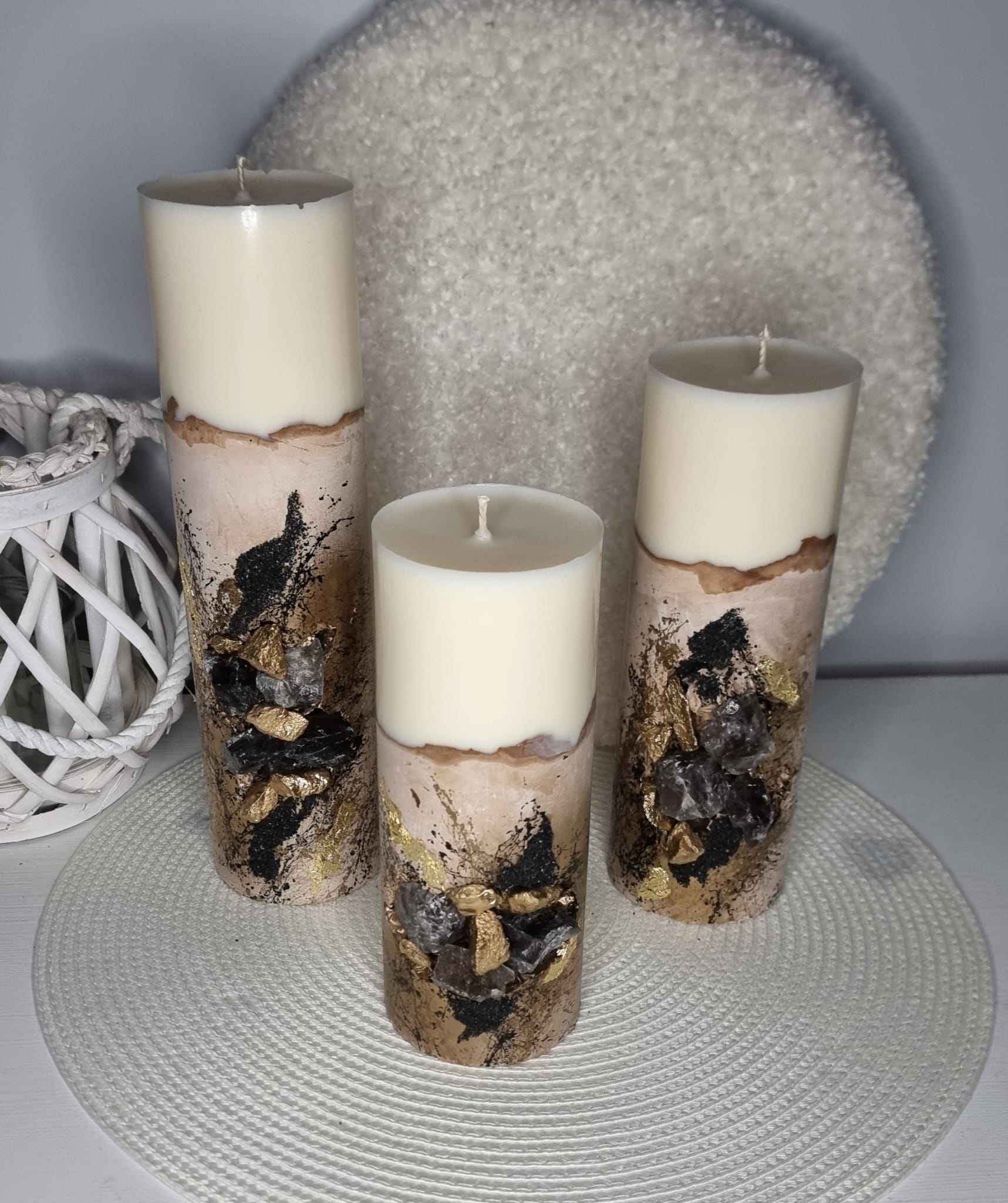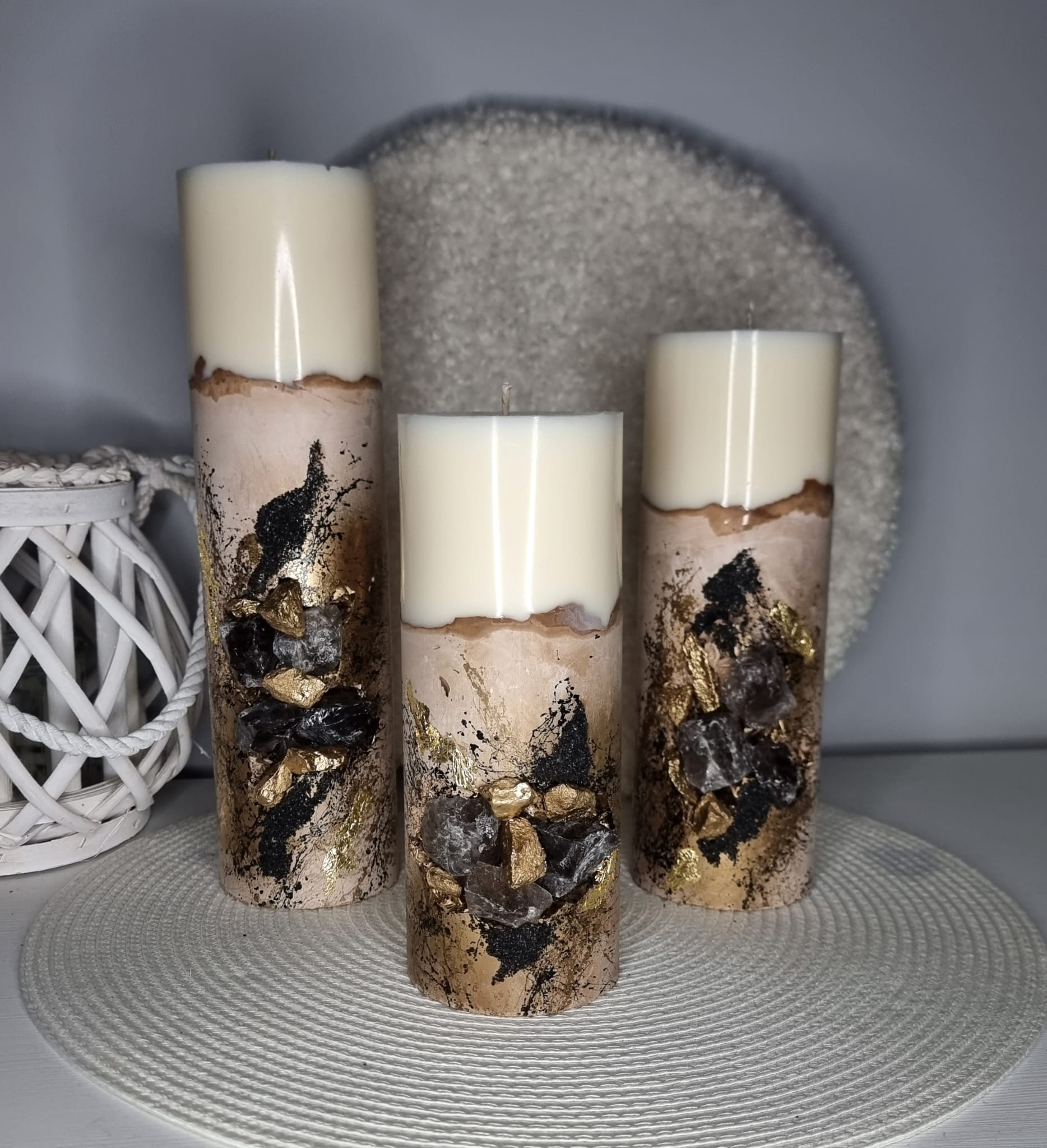 Komplektā trīs sveces : izmēri – mazā 19.cm , vidējā 23.cm , lielā 26cm , sveču diametrs 7.5cm