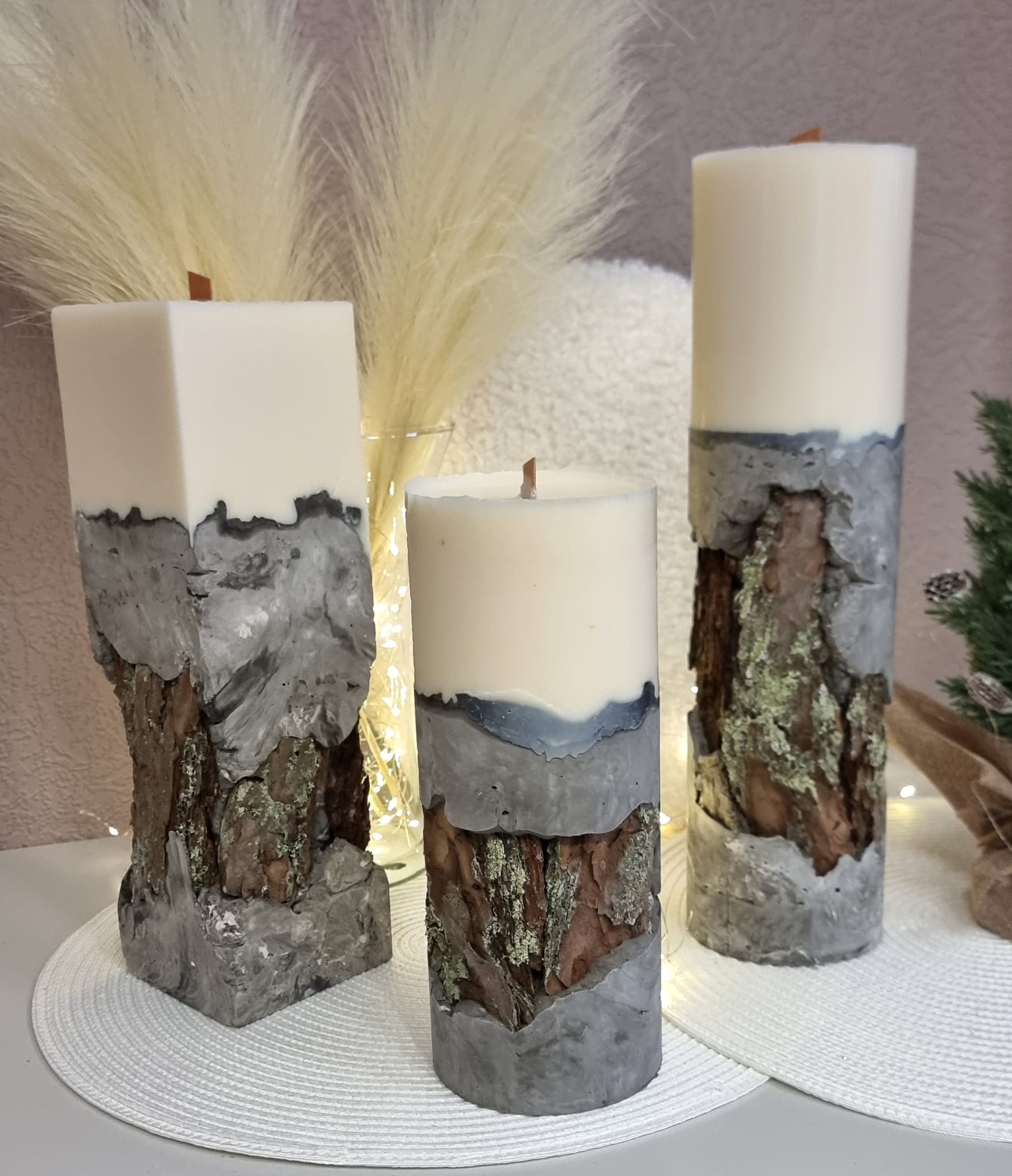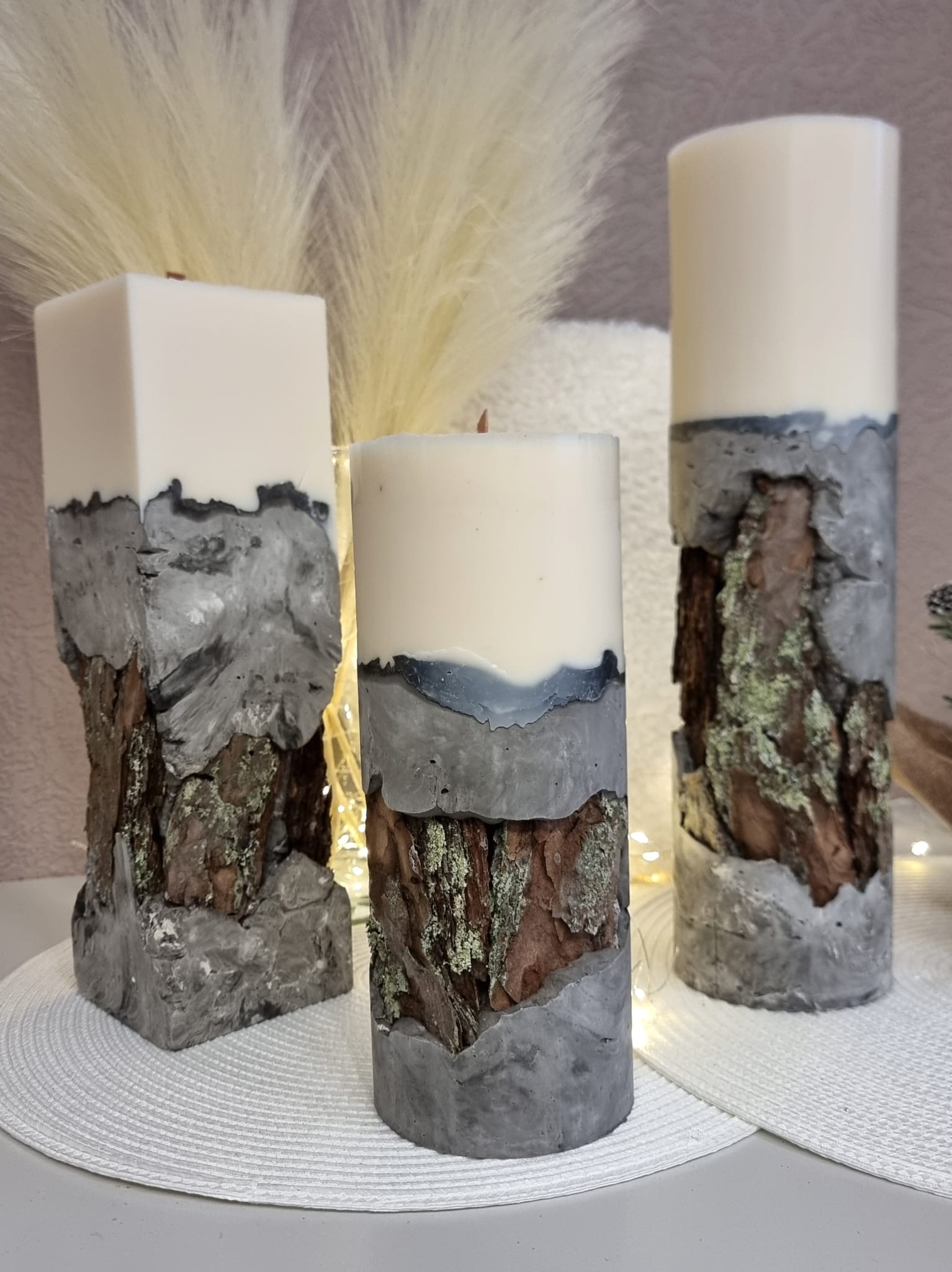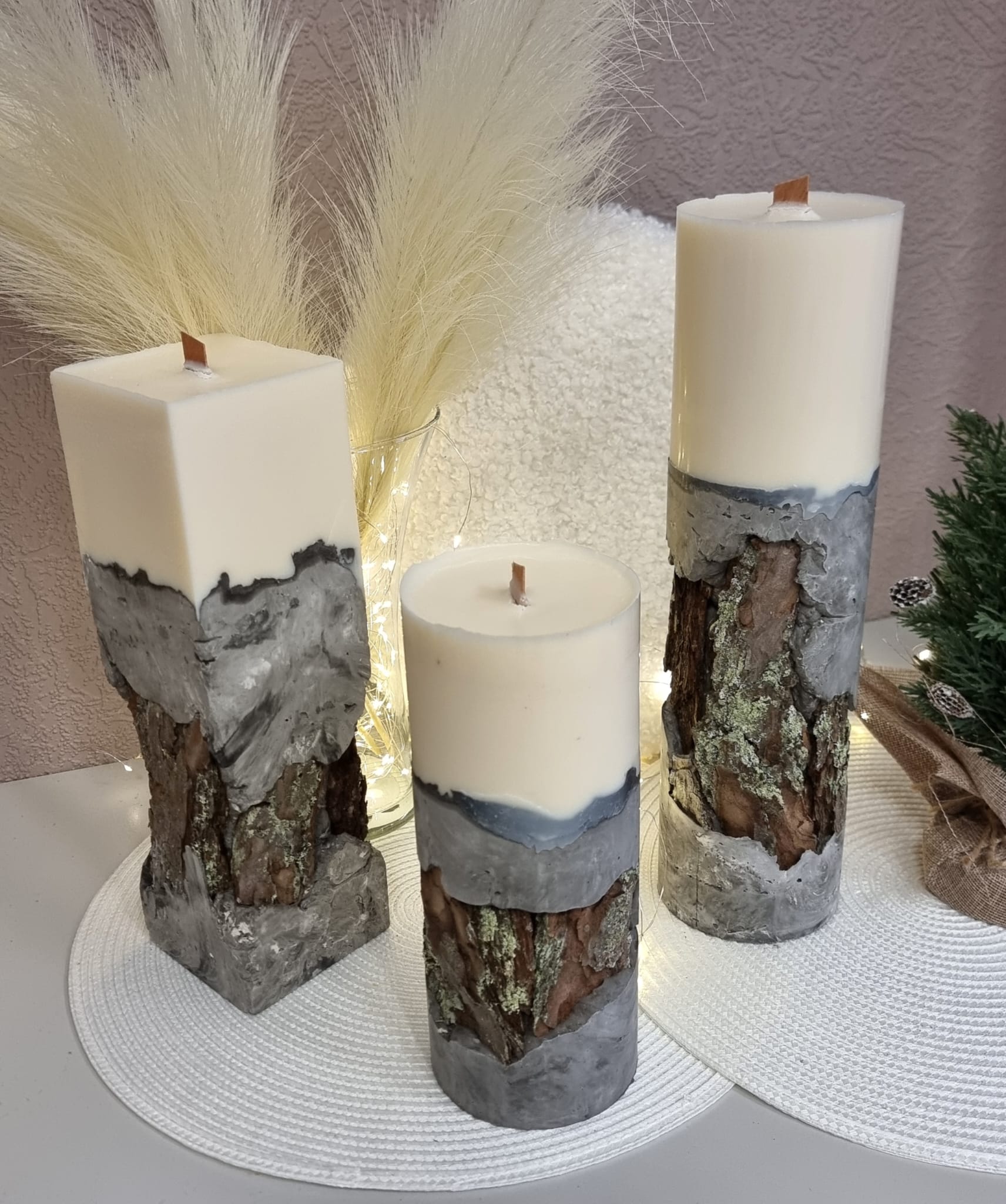 Sojas vasks bez smaržvielām! Sveces pamatne ir kā svečturis (paliekošs) vēlāk var likt virsū citas sveces! pamatnē iestrādāta koka miza..