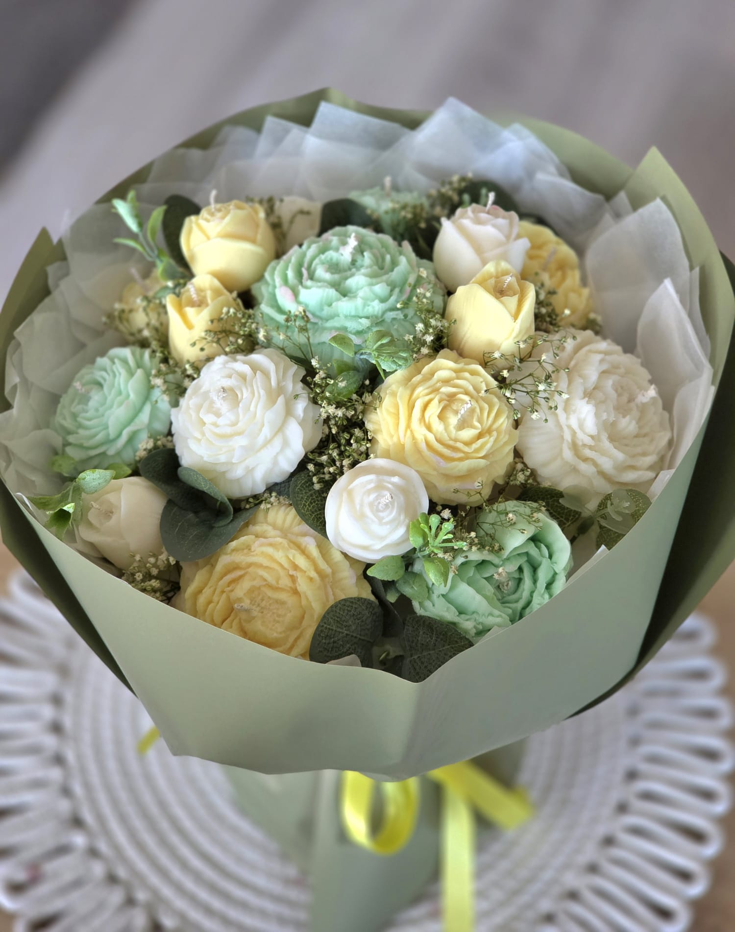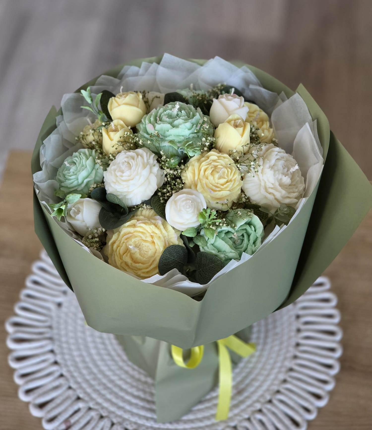 Sveces ir bez aromāta, tāpēc piemērotas arī cilvēkiem ar jutīgu ožu vai telpām, kur nevēlas papildu smaržas. Pušķis ir stabils un paredzēts novietošanai uz galda, bez nepieciešamības to papildus stiprināt vai balstīt.