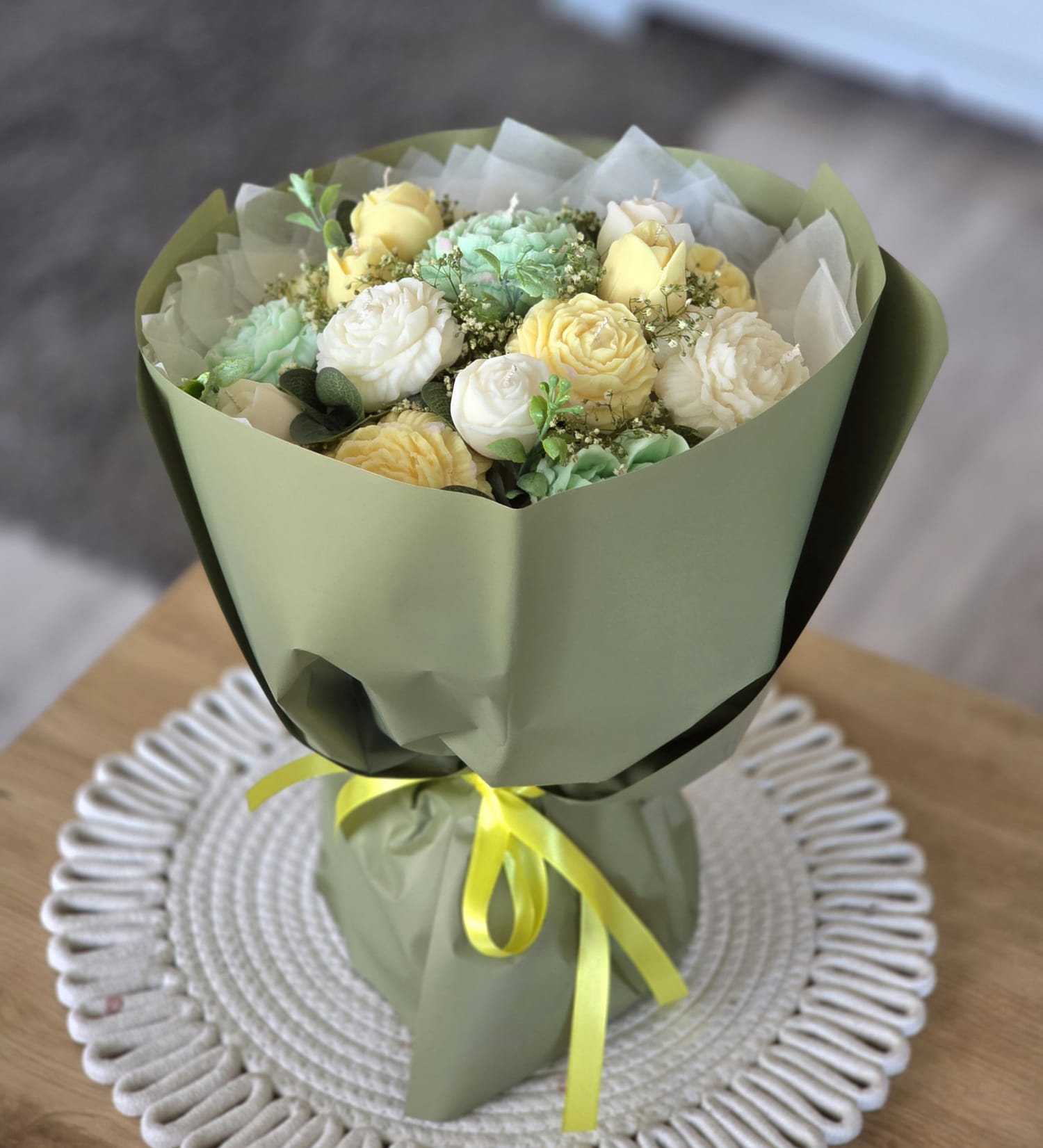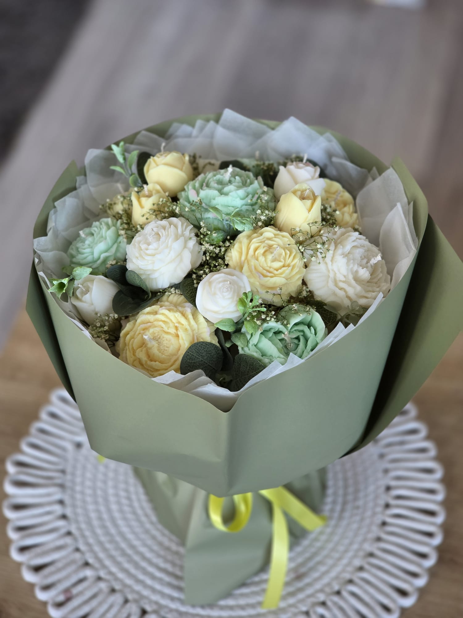 Elegants un gaumīgs sveču pušķis maigos toņos, kas kalpos gan kā izsmalcināts interjera akcents, gan kā īpaša dāvana nozīmīgos dzīves brīžos. Pušķis ir veidots no 19 dažāda izmēra sveču ziediem, radot bagātīgu, ziedošu kompozīciju.